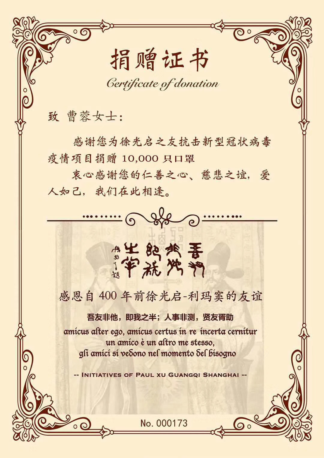 BQ Plus Medical向意大利教會捐贈了10,000個一次性防護口罩,以幫助當地的教會團體和醫院。出于感謝,教會向BQ頒發了捐贈證書。